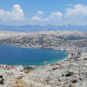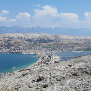 Blick auf Pag Stadt und die Bucht.