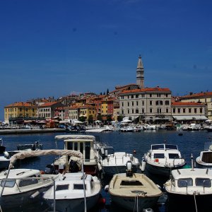 Fotos aus der Stadt Rovinj / Rovigno. 1763 wurde der kleine Meeresbereich zur Insel zugeschüttet. Somit wurde die bis dahin auf einer Felseninsel liegende Stadt ans Festland angebunden. Ein 1860 errichtetes Stadttor wurde mit dem venezianischen Markuslöwen geschmückt und steht an der nahtstelle zur einstigen Inselstadt. Weitere Infos erfahren Sie im Istrien Rovinj Forum.
