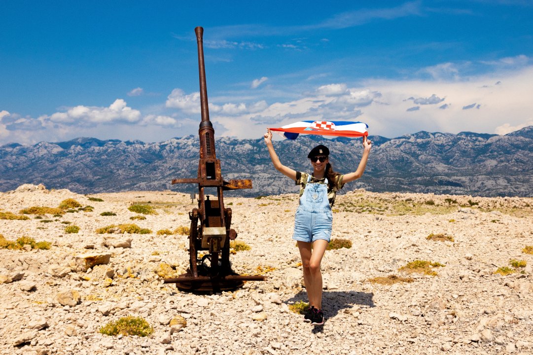 Einer der vielen von mir besuchten Schauplätze des Heimatkrieges, hier meine Tochter die Flagge zeigt, zu Ehren der kroatischen Verteidiger und eine Fliegerabwehrkanone (ein 40mm Bofors Geschütz) mit der Angriffe auf die "Paški Most" erfolgreich abgewehrt wurden...