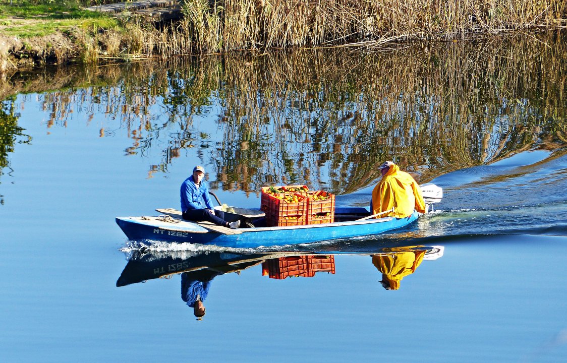 Mit solchen kleinen Kähnen wird das Obst auf der Neretva transportiert