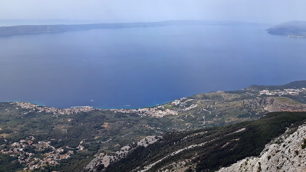 Blick auf Tučepi vom Biokovo Skywalk aus. Man kann die Jadranska Magistrale sehen, welche auch durch Tučepi führt.