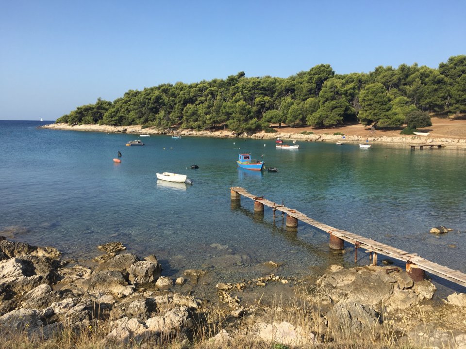 Istrien: Pula > Beach Valovine Brücke zu den Fischerbooten