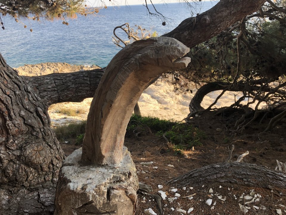 Wenn man den Lungo Mare von der Bucht Veli Zal zur Cikat Bucht entlang läuft kann man ein Kunstwerk besonderer Art sehen. Es hat sich jemand an einem Baumstumpf im Schnitzen versucht.