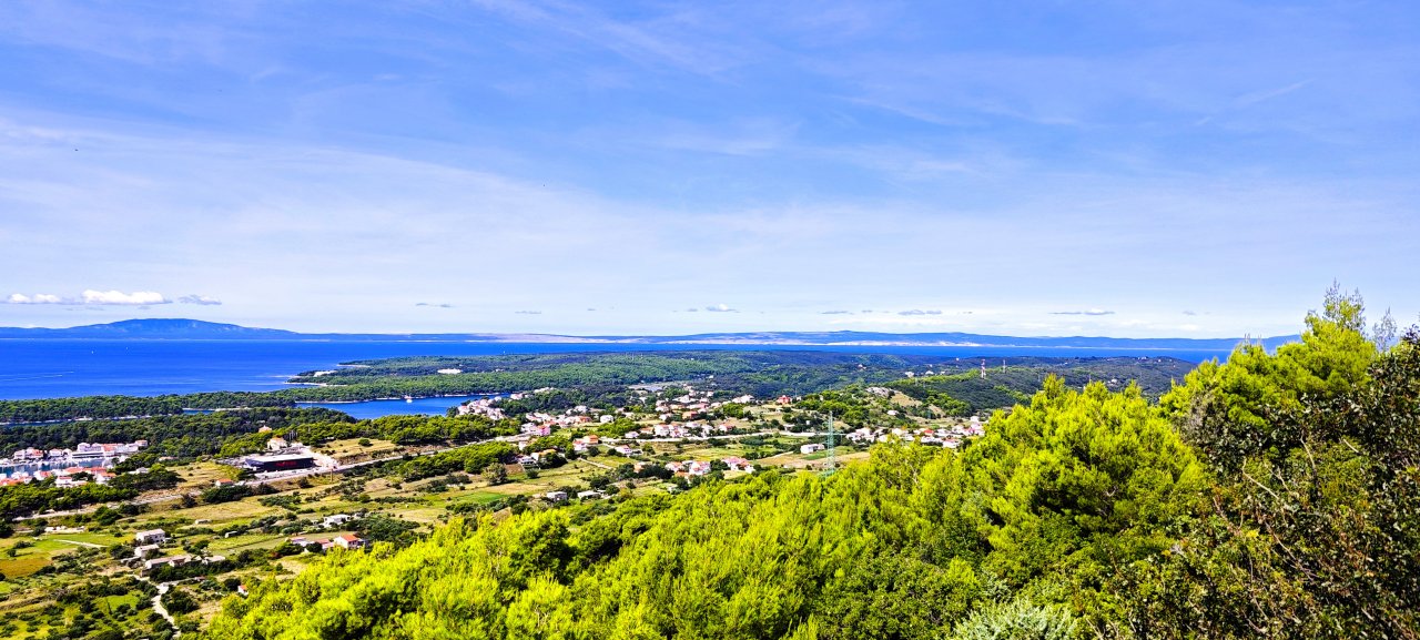 Vom Kamenjak geht der Blick über die grüne Insel. Schön ist der Kontrast zwischen grüner Natur und dem Blau von Wasser und Himmel.