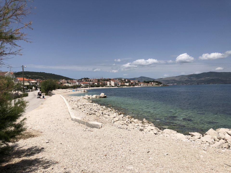Wenigstens haben die in der ersten Reihe einen besseren Ausblick auf den Friedhof von Sv. Kriza und den am Festland liegenden Hubschrauberlandeplatz der kroatischen Luftwaffe. Da gibt es immer was zu sehen. Entweder die Bewegungen der Luftwaffe, oder ab und zu eine Beerdigung. Wenn nicht, fließt wenigstens der gesamte Verkehr der Urlauber und Einheimischen auf dieser Seite der Insel bis nach Slatine hier vorbei.