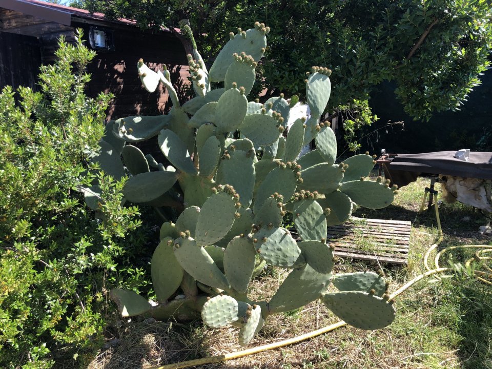 Große Kakteen, kurz vor der Blüte stehen verteilt auf dem Gelände.