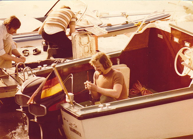 " Die sehr teuren schwarzen, richtig elegant aussehenden Mercury-Außenborder gefielen uns natürlich viel, viel besser als die eierschalfarbigen König-Außenborder. Aber die Mercurys konnten wir uns finanziell nicht leisten, aber Geld, um schwarzen Lack zu kaufen, hatten wir über. Also lackierten wir die "König-Eier" schwarz. So sahen sie aus der Ferne wie teure elegante Mercury-Außenborder aus. "