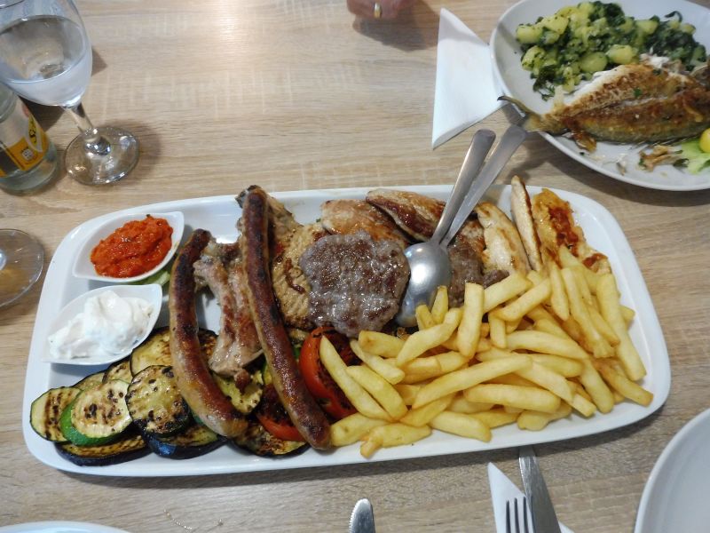 Wir haben eine Fleischplatte für zwei Personen gegessen, unser Bekannte Traudl Orada mit Kartoffeln und Mangold.