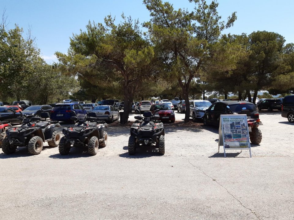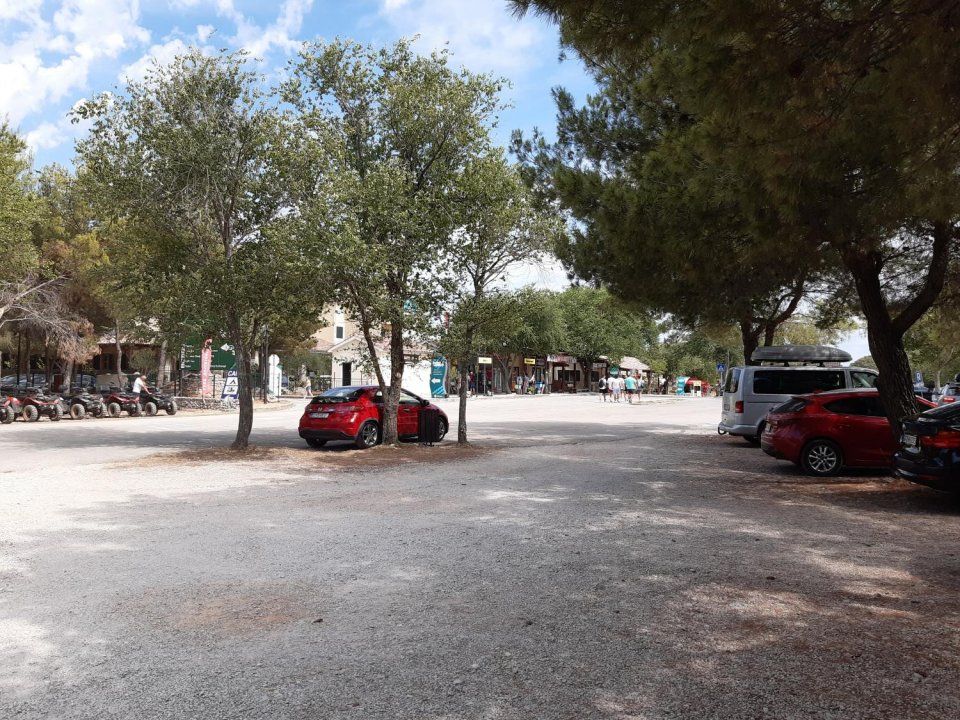 Wir hatten einen Wochentag gewählt und rechneten, auch der momentanen Situation geschuldet, mit nicht allzu viel Andrang. Aber weit gefehlt, denn der eigentliche, geteerte Parkplatz war bereits gerammelt voll, sodass wir etwas abseits auf dem großen unbefestigten Platz, auf dem auch der Busparkplatz ist, uns ein schattiges Plätzchen suchen mussten. Aber egal.