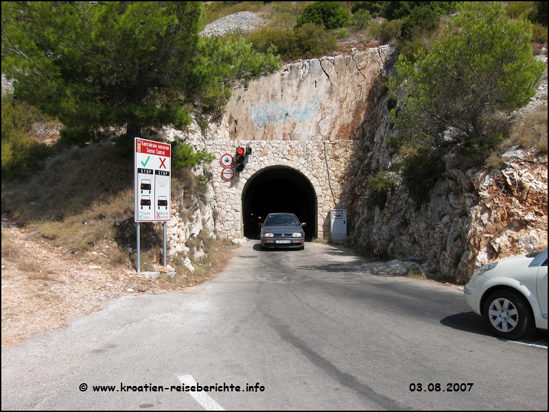 Mit dem Roller hab ich mal wieder die Gegend erkundet, als allererstes war mir wichtig, die Südseite der Insel zu sehen. Um dahin zu kommen, muss man bei dem Ort Pitve durch einen 1400 m langenTunnel, der gerade mal 2,2m breit und hoch ist - mit dem Wohnmobil besteht also gar keine Chance.