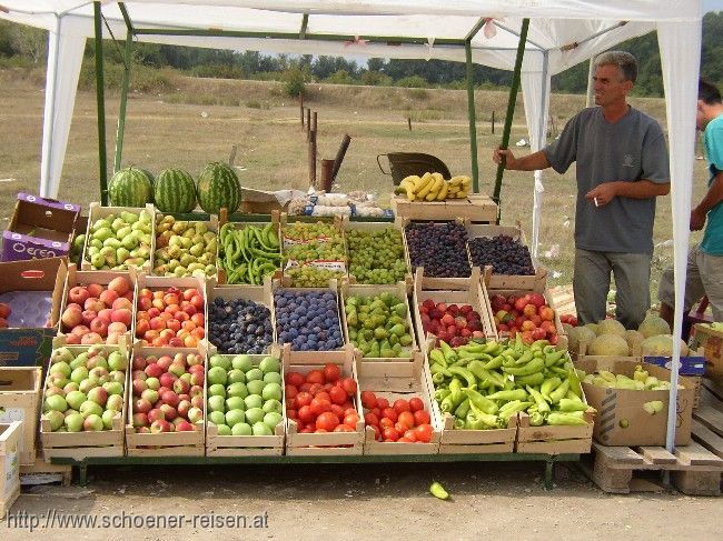 Es gibt dort einen kleinen Markt, auf dem es alles gibt, was das Land im August bietet: Obst, Gemüse, fast alles einheimisch.