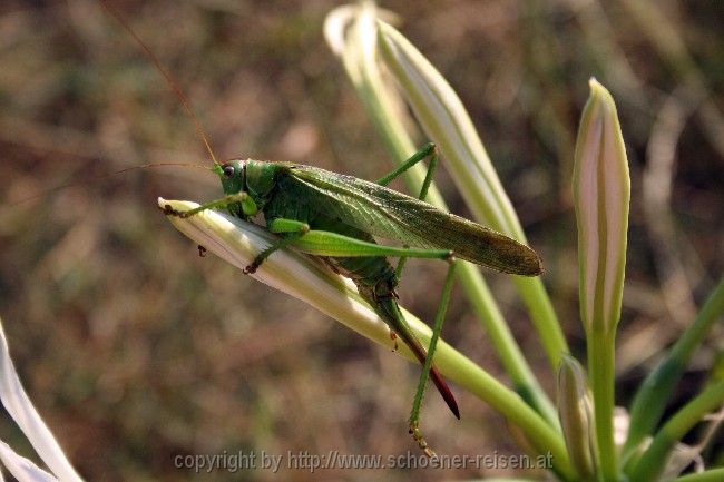 Ich fasste das Tier an und setzte es auf den Boden. Sofort nahm es eine Tarnhaltung an. Es klammerte sich an den Untergrund und stellte sich senkrecht. Im trockenen Gras hätte man es jetzt nicht mehr gesehen.